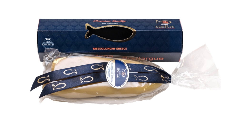 Premium quality Grey Mullet Roe, a 100% natural product, without preservatives, with a distinct yet delicate taste, velvety texture and a long aftertaste. Its colour ranges from golden yellow to golden reddish. A unique delicacy, with high nutritional value, is rich in Proteins, energy, Omega-3 fatty acids, Vitamins C and E, Selenium and Zinc. Protected by a 100% natural beeswax to preserve its natural moisture. Use it sliced or grated.